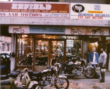 We landed in Delhi, found a cheap hotel and within three hours were in the Enfield Bullet showroom. After much negotiating, (about half of which was in Hindi through our Indian friend), we ended up parting with about a thousand pounds each for two 35Occ "special" Bullets. "Special" because they had been made to order for someone else, but we had more money and didn't want to wait 10 days for a normal one. The final sum also included money for the B.A. or Baksheesh Account, and money for getting the bikes registered quickly and to foreigners, I've still got the receipt with the B.A. entry on it. Also included was lifetime road tax, 6 months third party insurance, twin leading shoe front brakes, chrome tank, rear carrier, 12V electrics and a huge pair of leg shields / dog deflectors. When we asked about the dubious quality of the rack the salesman said it was like Japanese things, not made to last forever. Well that was it, we'd paid for two brand new bikes, to be collected the next day, within seven hours of arriving in India. Not bad.